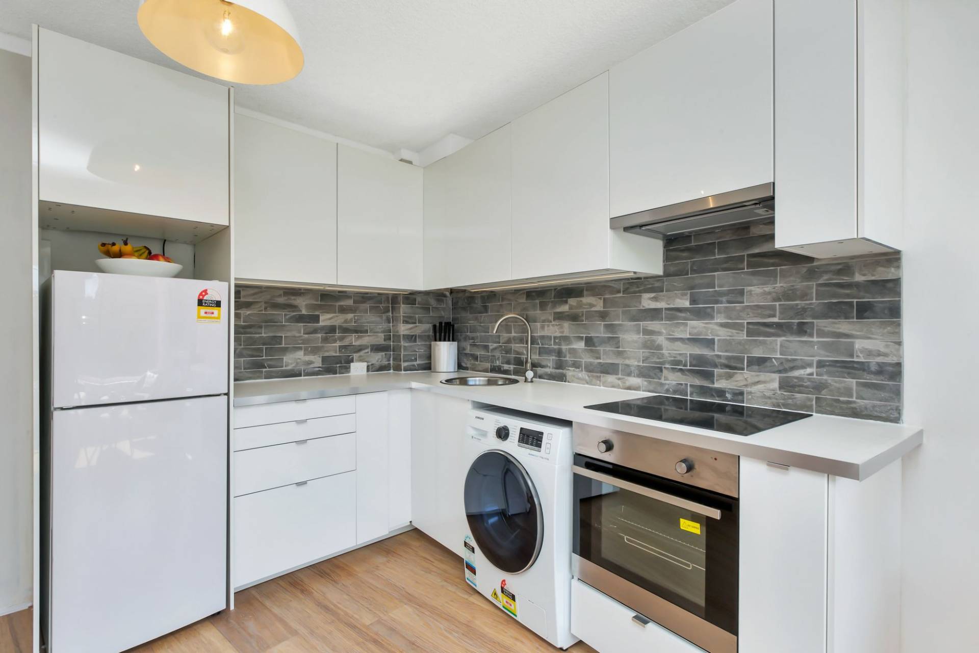 Fully renovated kitchen complete with microwave, ceramic stovetop, oven and full-size refrigerator